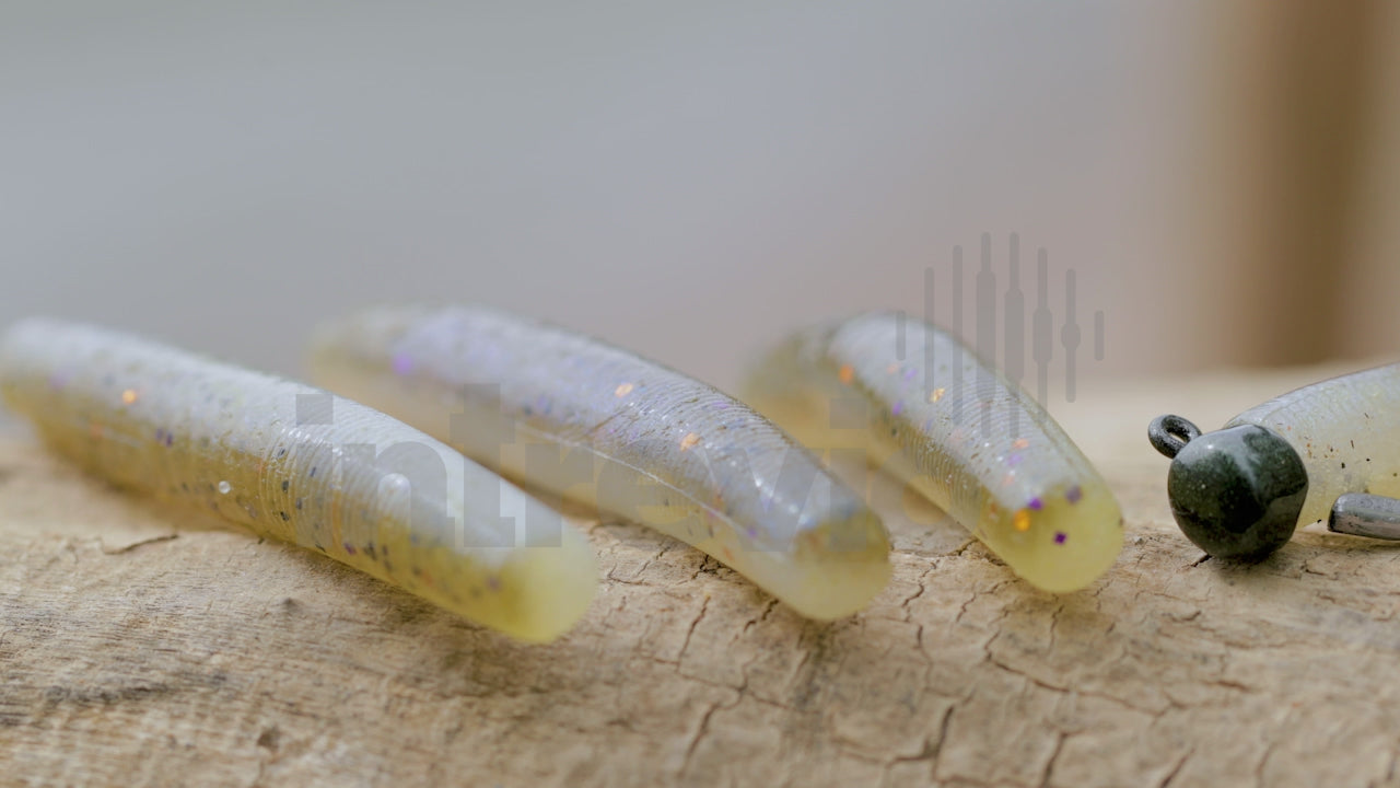 Shots of a Ned Rig rigged and ready, highlighting the finesse-style bait and jig head combo. Smooth camera movement and natural tones give a realistic outdoor feel.